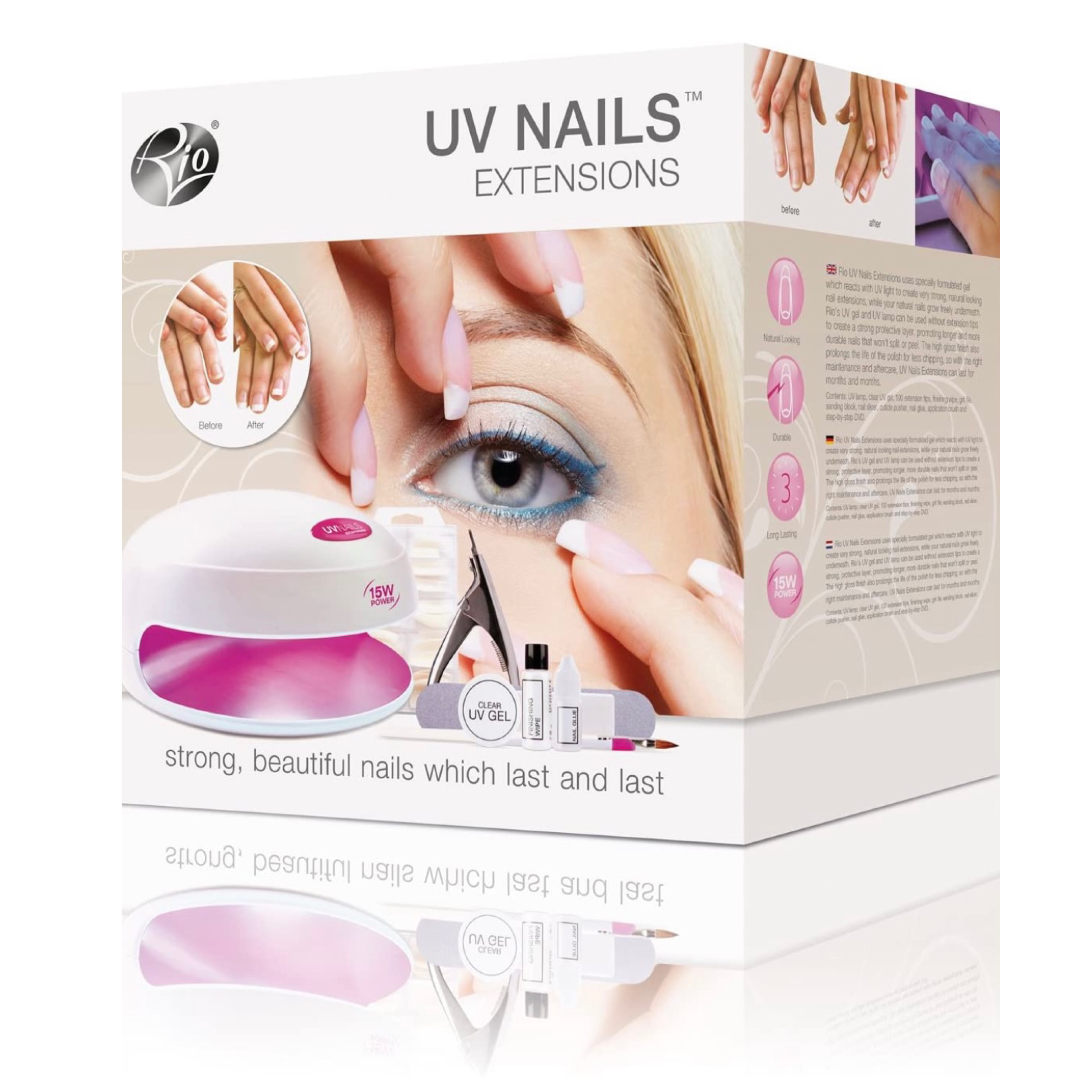 Rio UV Nails Extensions používa špeciálne vyvinutý gél, ktorý reaguje s UV svetlom a vytvára veľmi silné, prirodzene vyzerajúce predĺženie nechtov, zatiaľ čo vaše prirodzené nechty voľne rastú pod nimi. UV gél a UV lampu Rio je možné použiť bez predlžovacích hrotov na vytvorenie silnej ochrannej vrstvy, ktorá podporuje dlhšie a odolnejšie nechty, ktoré sa nebudú štiepiť ani lúpať. Vysoko lesklá povrchová úprava tiež predlžuje životnosť laku pre menšie štiepanie, takže pri správnej údržbe a následnej starostlivosti môžu predĺženia nechtov trvať mesiace a mesiace. Zahrnuté je podrobné DVD, ktoré vám ukáže všetko, čo potrebujete vedieť o domácom ošetrení ako v salóne od fázy prípravy až po aplikáciu, odstránenie a následnú starostlivosť.