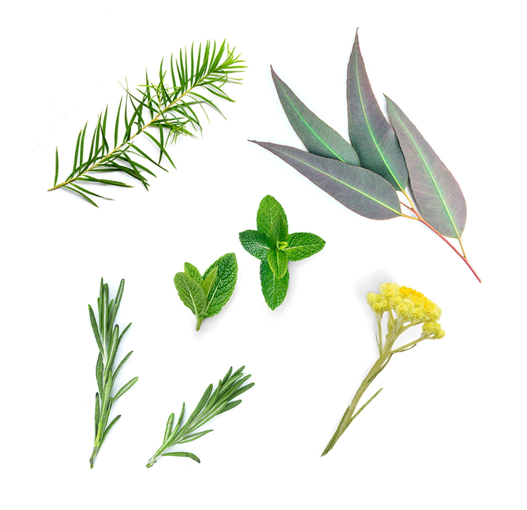 Olej z Cocos nucifera (kokos), tapiokový škrob, vosk zo semien Helianthus annuus (slnečnica), mentol, olej z listov/stoniek Mentha canadensis, olej z listov/stoniek Rosmarinus officinalis (rozmarín), olej zo živice Copaifera coriacea/ langsdorffii/ officinalis/ reticulata, voda (Aqua), olej z plodov/semien Illicium verum (badián), olej Mentha citrata, olej Mentha piperita (mäta pieporná), výťažok z plodov Sambucus nigra, olej z Prunus amygdalus dulcis (mandľa obyčajná), glyceryl laurát, glyceryl kaprylát, olej z listov Eucalyptus globulus, olej z listov Melaleuca alternifolia (čajovník), olej z kvetov/listov/stoniek Helichrysum italicum, olej z kvetov/listov/stoniek Tanacetum annum, olej Chamomilla recutita (rumanček), glyceryl undecylenát, výťažok z plodov Capsicum frutescens, glycerín, kyselina laurová, olej z lístkov gaultheria procumbens (gaultéria), kyselina citrónová, limonén, linalool.